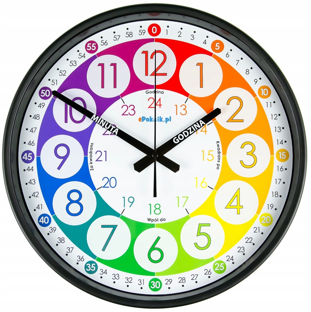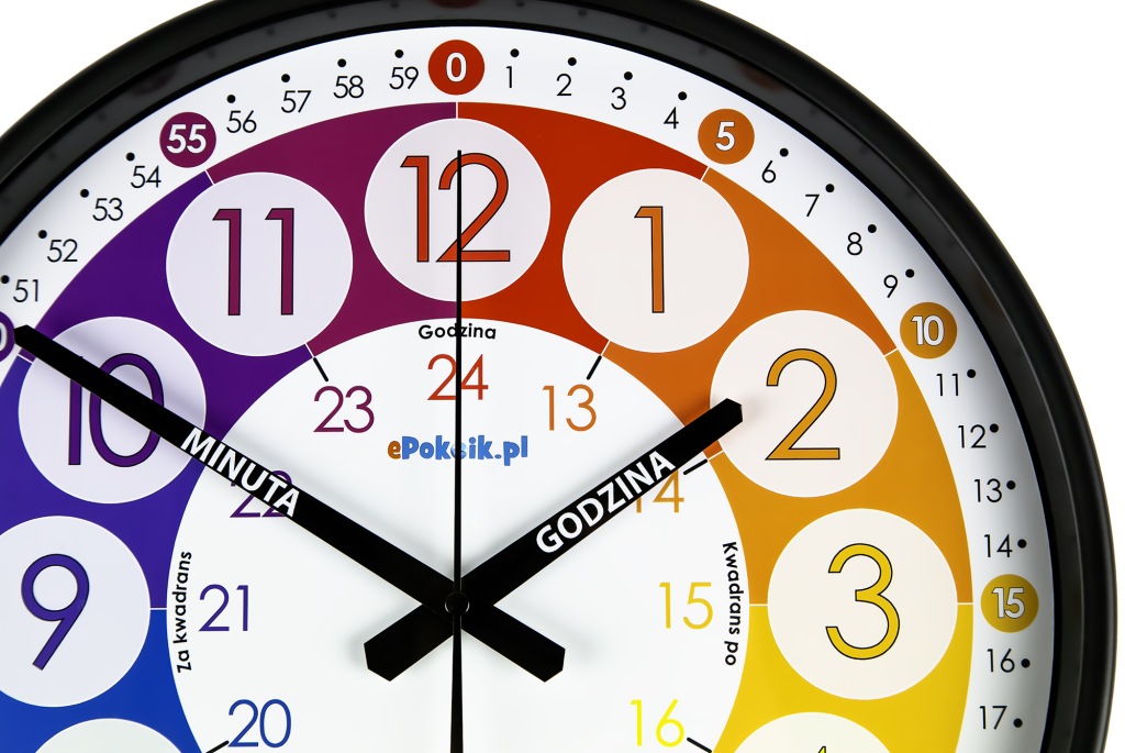 Zegar przygotowany tak, by prawidłowy odczyt czasu przestał nastręczać trudności a zaczął być przyjemnością. Specjalne wykonanie wskazówek z opisem przeznaczenia GODZINA i MINUTA efektywnie wspomagają naukę.