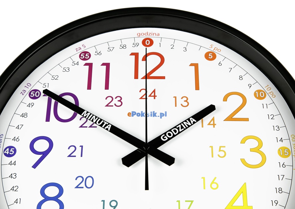 Zegar przygotowany tak, by prawidłowy odczyt czasu przestał nastręczać trudności a zaczął być przyjemnością. Specjalne wykonanie wskazówek z opisem przeznaczenia GODZINA i MINUTA efektywnie wspomagają naukę.