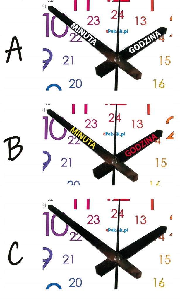 Domyślnymi wskazówkami przy zakupie są wskazówki z napisami w kolorze białym (wzór A). Wskazówki można zamówić także kolorze żółtym i czerwony (wzór B) lub bez napisów w całości w kolorze czarnym (wzór C).